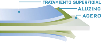 CALAMINON se fabrica con Acero laminado en frío, recubierto con ALUZINC El Aluminio protege las planchas gracias a la formación de una lámina insoluble de óxido de aluminio. El Zinc proporciona protección catódica evitando la oxidación en zonas expuestas por cortes, perforaciones o ralladuras.